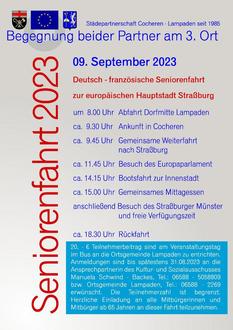 Anlässlich des 38 jährigen Jubiläums unserer deutsch französischen Partnerschaft zwischen Cocheren und Lampaden, bieten wir ebenso eine Seniorenfahrt am 09.09.2023 in die europäische Hauptstadt Straßburg an. Die wunderschöne Grande Île, das imposante Münster, kulturelle Highlights und das Europaparlament in Straßburg lassen Kunst, Kultur und Politik auf einzigartige Weise zusammentreffen. Straßburg nennt sich die „Hauptstadt Europas“, und diesen Namen verdient sie nicht nur wegen des Europaparlaments, das seinen Sitz dort hat. Besonders sehenswert ist das Straßburger Münster wegen seiner filigran und reich verzierten Außenfassade. Vor allem der 140 Meter hohe Turm, die Hauptfassade mit den Portalstatuen und die Fensterrosen mit einem Durchmesser von rund 15 Metern sind besonders sehenswert. Ein Teil davon wollen wir mit Seniorinnen und Senioren aus Cocheren und Lampaden gemeinsam besuchen und erleben. Die Teilnehmerzahl ist begrenzt. Herzliche Einladung an alle Mitbürgerinnen und Mitbürger aus Lampaden ab 65 Jahren an dieser Fahrt teilzunehmen. Anmeldungen sind bis zum 31.08.2023 an Manuela Schwind-Backes unter 06588 5058809 sowie an die Ortsgemeinde Lampaden unter 06588 2269 möglich.