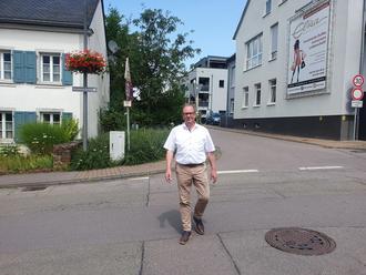 Bürgermeister Jürgen Dixius überquert die Hauptstraße im Stadtteil Beurig, dort, wo zukünftig die Lichtsignalanlage sicher über die Straße führen wird.