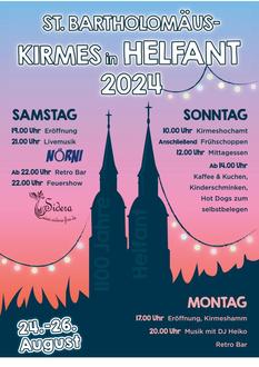 mit großer Freude erwarten wir unsere traditionelle Helfanter St. Bartholomäuskirmes, die wir in diesem Jahr vom 24. bis 26. August feiern. Auf ein Wiedersehen mit unseren Dorfbewohnern und Kirmesgästen von nah und fern mit Familie und Freunden. Da wir in diesem Jahr 1100 Jahre Helfant feiern dürfen, erwartet uns ein besonderes Programm: