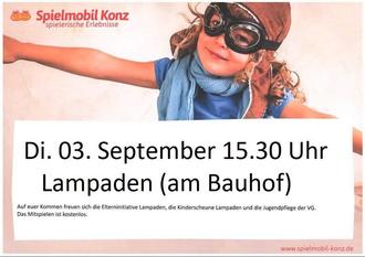 Das feuerrote Spielmobil steht am Dienstag, 3. September, von 15.30 bis 18.30 Uhr, auf dem Gelände des Bauhofs in Lampaden, Auf der Träf 35. Sämtliche Spielgeräte des Spielmobil Konz stehen den Kindern kostenlos zur Verfügung: Modul „Spiel & Spaß Spektakel“ mit Rollenbahn, Turmspektakel, Kinderrodeo, Hüpfburg, Riesenbaustein sowie Spielwiesenset. Der angrenzende Spielplatz mit Schaukeln, Spielturm, Sandspielfeld, Wippe, Hüpfpferden und Nestschaukel ergänzt das spaßbringende Spieleangebot. Kohlhaas Imbissstand versorgt alle Teilnehmer mit Essen und Getränken, leckeres Eis gibt es vom Eis Träumchen.