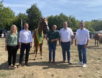 Belle Unique ist die Siegerstute der Tierschau. Das Bild zeigt v.l. Bundestagsabgeordnete Verena Hubertz, Landrat Stefan Metzdorf, Besitzer Alfred Kohn, Erster Beigeordneter Martin Alten und Landtagsabgeordneter Christian Baldauf.