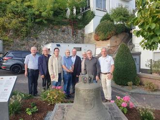 Die Projektbeteiligten aus Verkehrs- und Verschönerungsverein sowie Kulturgießerei gemeinsam mit Bürgermeister Jürgen an der neu aufgestellten Jubiläumsglocke im Staden