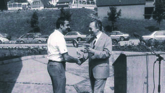 Schlüsselübergabe durch den damaligen Bürgermeister der Verbandsgemeinde Saarburg Dr. Hans Houy