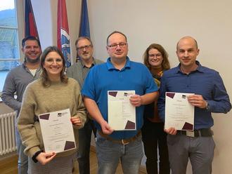 Sarah Adams, Thorsten Biwer, Tobias Trampert und Steffen Zigenhorn haben ihre Fortbildung „Verwaltungslehrgang I“ erfolgreich abgeschlossen und bekamen im Rahmen einer kleinen Feierstunde in der Verwaltung ihre Urkunden überreicht. Erste Beigeordnete Simone Thiel gratulierte den Absolventen zur bestandenen Prüfung und zeigte sich erfreut, so viele engagierte und Mitarbeiterinnen und Mitarbeiter in den Reihen der Verwaltung zu haben. Büroleiter Rudolf Klein und Personalleiter Florian Weckmüller schlossen sich den Glückwünschen an.
