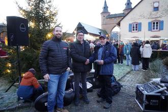 v.l. Erster Ortsbeigeordneter Tobias Marx, Ortsbürgermeister Michael Lauer, 1. Vorsitzender der NoKa Klaus Stüber bei der Übergabe der Spende auf Burg Heid