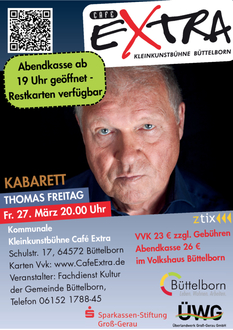 https://ztix.de/5319/events/cafe-extra-thomas-freitag-7FPEQ1 oder ab 19 Uhr am Veranstaltungstag an der Abendkasse.