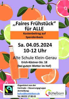Die Fairtrade-Steuerungsgruppe organisiert wieder das beliebte „Faire Frühstück“ am Samstag, 04. Mai in oder bei gutem Wetter auf dem Hof der Alten Schule in Klein-Gerau. Von 10.00 bis 12.00 Uhr sind alle interessierten Bürger*innen und Gäste eingeladen gemeinsam mit den Aktiven der Steuerungsgruppe zu frühstücken, fair gehandelte Lebensmittel kennenzulernen und zu probieren.
