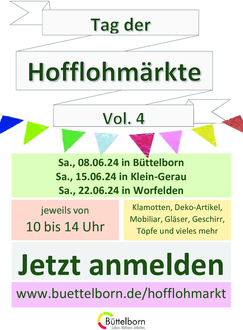Auch in diesem Jahr findet wieder der Hofflohmarkt in der Gemeinde Büttelborn statt. Im Ortsteil Büttelborn am 8.6., in Klein-Gerau am 15.6. und in Worfelden am 22.6., jeweils von 10-14 Uhr.