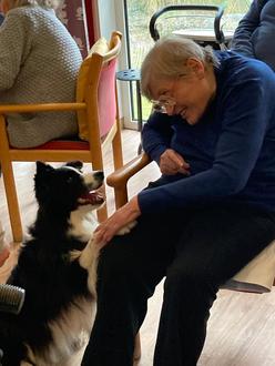 Linus und Daisy konnten mit ihren Vorführungen die Senior*innen mehr als begeistern. Zum Abschluss gab Daisy den Senior*innen dann noch Pfötchen und wer wollte, auch noch ein Küsschen.