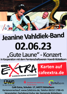 Durch ihre besondere Musik und die erfrischende Art wird sofort klar: egal wie der Tag war, diese Gute Laune-Tour wirkt. Die ungewöhnlichen Klänge der Orchesterharfe, gemischt mit Gesang, unzähligen Percussioninstrumenten, Ukulelenbass und Hawaiigitarre, lassen jeden Song mit neuen Facetten erblühen. Man denkt an Reggae, Pop, Jazz und Singer-Songwriter. Ein Konzert der Band ist dadurch sehr kurzweilig und besticht vor allem auch durch das Miteinander der beiden Musiker. Dass dabei alle Finger, Arme und Beine der Zwei in fast unwirklichen Kombinationen die unterschiedlichsten Klänge hervorbringen, erweckt im Zuschauer Faszination. Wenn Jeanine Vahldiek und Steffen Haß die Bühne betreten, dann beginnt eine beruhigende Leichtigkeit den Raum zu durchstrahlen. Fangen die Beiden zu spielen an, hat diese Energie den Hörer längst erreicht und bringt ihn in eine andere Welt, in der er begreift, dass er selbst entscheiden kann, glücklich und zufrieden zu sein. 2009 gründeten die beiden Musiker die JEANINE VAHLDIEK BAND und veröffentlichten 2019 ihr bereits fünftes Album "Kitschig Wunderbar", das erste mit ausschließlich deutschen Texten. Bei gutem Wetter findet das Konzert openair im Garten des Café Extra statt. Für leckere Spargelhäppchen sorgt der Partnerschaftsverein Hoerdt-Büttelborn e.V. Eine Veranstaltung im Rahmen der Spargeltage im Gerauer Land.