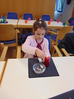 Nach dem theoretischen Teil ging es dann gleich an die praktische Umsetzung. Jedes Kind durfte sich daran versuchen, selbst eine Kerze mit einem Streichholz zu entzünden.
