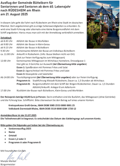 Ausflug der Gemeinde Büttelborn für Seniorinnen und Senioren ab dem 60. Lebensjahr nach RÜDESHEIM am Rhein am 21. August 2025