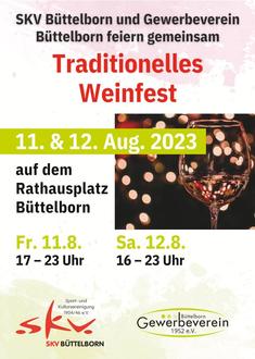 Nach dem großen Zuspruch im letzten Jahr findet das Weinfest auch diesmal an zwei Tagen auf dem Rathausplatz statt, wobei erstmals der Gewerbeverein und die Fußballabteilung der SKV Büttelborn gemeinsam Veranstalter sind. Am Freitag den 11.08.2023 von 17.00 bis 23.00 Uhr und am Samstag, den 12.08.2023 von 16.00 bis 23.00 Uhr besteht wieder Gelegenheit, die besten Weine von rheinhessischen Winzern in geselliger Runde zu probieren