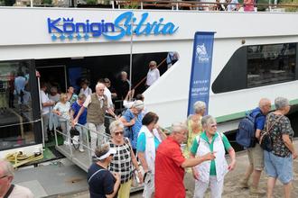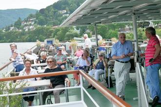 Bürgermeister Marcus Merkel informierte in seiner Begrüßungsansprache an Bord um die geänderten Umstände. „Die Planänderung bringt uns eine längere Schifffahrt auf der „Königin Silvia“ bis zum Wendepunkt in Hirschhorn. Nutzen wir die Zeit für nette Gespräche und zur Entspannung!“