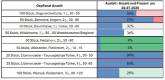 Im Februar 2024 pflanzte man auf ausgewählten Flächen verschiedene heimische und potenziell klimaresiliente Baumarten im Abstand von 6 × 6 Metern, darunter Stieleiche, Vogelkirsche, Feldahorn sowie Atlas- und Libanonzeder. Eine künstliche Bewässerung erfolgte nicht. Nach rund zwei Jahren zeigen sich deutliche Unterschiede in den Anwuchsraten: Während Wildkirsche, Feldahorn und Atlaszeder gute Ergebnisse erzielen, kam es bei der Libanonzeder zu größeren Ausfällen, vermutlich bedingt durch Spätfröste und sommerliche Trockenheit. Die Stieleichen aus Naturverjüngung erweisen sich bislang als robust.