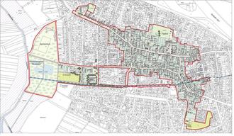 Abb.: Fördergebiet „Stadtumbau Ortskern Büttelborn“ – Eigentümerinnen und Eigentümer innerhalb dieser Grenzen (farbig markierte Flächen) können durch das Anreizprogramm gefördert werden | Quelle: Gemeinde Büttelborn