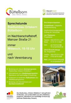 Immer mittwochs von 15 bis 18 Uhr oder nach Vereinbarung, können interessierte Bürgerinnen und Bürger mehr über das Städtebauförderprogramm „Stadtumbau Ortskern Büttelborn“ erfahren (inzwischen umbenannt in „Wachstum und nachhaltige Erneuerung“), sich zum neuen Anreizprogramm beraten lassen, sich zu laufenden Maßnahmen des Städtebauprogramms austauschen oder Fragen zur Nutzung des Nachbarschaftstreffs klären.