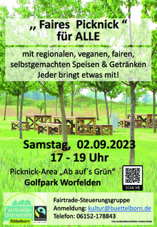 Zu einem gemeinsamen, nachhaltigen und regionalen Picknick lädt die Fairtrade-Steuerungsgruppe der Gemeinde Büttelborn alle Interessierten ein für Samstag, 02.09.2023 ab 17.00 Uhr an das Picknick-Areal „Ab auf`s Grün“ am Golfpark in Worfelden.
