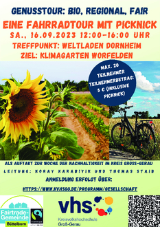 Erstmals laden die Kreisvolkshochschule Groß-Gerau und die Fairtrade-Steuerungsgruppe Büttelborn zum Start der „Fairen Wochen zum Thema Klimagerechtigkeit“ Interessierte zu einer Fahrradtour ein.