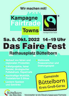 Am Samstag, 8. Oktober 2022, von 14.00 bis 19.00 Uhr findet das zweite „Faire Fest“ auf dem Rathausplatz in Büttelborn statt, bei dem sich das Netzwerk Fairtrade der Gemeinde Büttelborn präsentiert. Dabei steht das gesamte Fest unter dem Motto „fair, regional, biologisch und nachhaltig“! Neben einem Verkaufsstand des Weltladens Dornheim mit einem vielfältigen Sortiment an fair gehandelten Waren – Kaffee, Tee, Honig, Schokolade und diverse Artikel aus dem Bereich Deko und Textil - gibt es viele regionale und fair gehandelte Produkte zu kaufen. Selbstverständlich werden auch das Essen und die Getränke regional, vegetarisch, bio und fair sein, denn alle beteiligten Gastronomen und Vereine sind Mitglieder des örtlichen Netzwerkes Fairtrade.