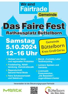 Am Samstag, 5. Oktober 2024, von 12.00 bis 16.00 Uhr findet wieder das „Faire Fest“ auf dem Rathausplatz in Büttelborn statt, bei dem sich das Netzwerk Fairtrade der Gemeinde Büttelborn präsentiert. Dabei steht das gesamte Fest unter dem Motto „fair, regional, biologisch und nachhaltig“! Neben einem Verkaufsstand des Weltladens Dornheim mit einem vielfältigen Sortiment an fair gehandelten Waren - Kaffee, Tee, Honig, Schokolade und diverse Artikel aus dem Bereich Deko und Textil - gibt es viele regionale, fair gehandelte Produkte sowie gerettete Lebensmittel. Selbstverständlich werden auch das Essen und die Getränke regional, vegetarisch, bio und fair sein. U.a. lädt das Netzwerk Fairplay Hessen zu einem Demokratiecafé. Außerdem präsentieren sich der Hilfsverein „Schenk ein Lächeln“ und die Lateinamerikahilfe der katholischen Kirche sowie der Waldkindergarten. Der NABU und die AWS Büttelborn informieren über aktuelle Natur- und Klimaschutzprojekte sowie das Thema „Mülltrennung“. Apfelwein, Apfelsaft und Honig von örtlichen Streuobstwiesen werden angeboten. Die Fairtrade Steuerungsgruppe des Kreises Groß-Gerau präsentiert „Die Karte von morgen“, informiert über nachhaltige Mobilität und jede*r Besucher*in kann spielerisch den eigenen ökologischen Fußabdruck errechnen. Auch die Kreisvolkshochschule stellt ihr Herbstprogramm in den Bereichen Umweltbildung und Gesundheitsprävention vor.