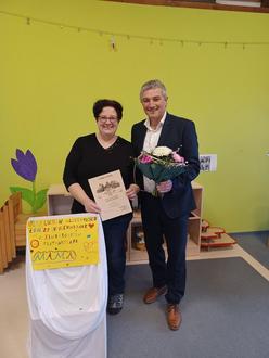 Am Montag gratulierte Bürgermeister Marcus Merkel seiner Mitarbeiterin, Tanja Stock, bei einer Feierstunde in der KITA Platanenstraße zum 25-jährigen Dienstjubiläum.