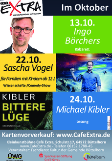 Am Freitag, 13.10. um 20 Uhr ist Ingo Börchers zu Gast mit seinem Kabarett-Programm „Das Würde des Menschen“. Erleben Sie einen Abend voller philosophisch-satirischer Gedankenspiele: Haltung bewahren und Bewährtes aufgeben. Den Ausnahmezustand zur Regel machen und Fragen stellen. Das ist Kabarett einmal anders gedacht: Nicht "Was ist schlecht gelaufen?", sondern "Wie könnte es besser sein?". Am Sonntag, 22.10., 17 Uhr ist Sascha Vogel zu Gast mit seinem Wissenschafts- und Comedy-Programm „Physik in Hollywood“ für Familien mit Kindern ab 12 Jahren. In seinem Programm erfahrt ihr, was Spiderman mit Physik zu tun hat und wie es Iron Man schafft, seinen Teilchen-Beschleuniger so schnell zu bauen. Aber keine Angst - hier geht’s nicht um Formeln, sondern um den Spaß an & in der Wissenschaft! In Vogels Rundumschlag durch die Filmwelt bleibt mit Sicherheit kein Auge trocken, ein lustiger Abend für Jung und Alt. Am Dienstag, 24.10., 20 Uhr stellt Michael Kibler seinem neuen Kriminalroman „Bittere Lüge“ im Café Extra vor. Horndeich und Jana rollen die Geschichte von Jana‘s Elternhaus und seiner Mieter auf. Dabei stoßen sie auf Geheimnisse, die vielleicht besser im Verborgenen geblieben wären. Eine Lesung im Rahmen von „Bücher und mehr“ des Kreises Groß-Gera.