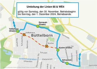 Aufgrund des Büttelborner Weihnachtsmarktes werden die Linien 65 (Groß-Gerau – Büttelborn – Klein-Gerau – Worfelden – Mörfelden) und WE4 (Darmstadt – Riedbahn – Weiterstadt – Groß-Gerau) dort von Samstag, den 30. November, Betriebsbeginn bis Sonntag, den 1. Dezember 2024, Betriebsende innerorts umgeleitet.