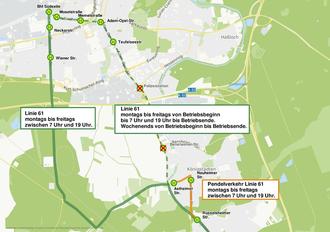 Außerhalb des oben genannten Zeitraums, also auch samstags und sonntags, verkehrt die Linie 61 regulär!
