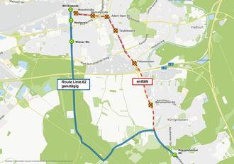 Bei der Linie 62 werden alle Fahrten über die beschriebene Umleitungsstrecke der Linie 61 geführt. Fahrgäste der Linien 61 und 62 mit Zielen im Osten von Rüsselsheim werden gebeten, an der Haltestelle “Moselstraße” auf die Busse der Stadtwerke Rüsselsheim oder die Linie 67 (Rüsselsheim – Mörfelden – Walldorf – Frankfurt