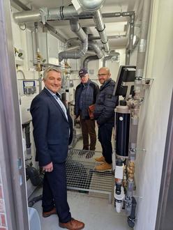 Viktor Schmidt (rechts im Bild) - betreute das Projekt seitens der Gemeinde als Projektleiter - erläutert Heinz Josef Sandner (Gemeindevorstandsmitglied) und Marcus Merkel die Technik der Anlage.