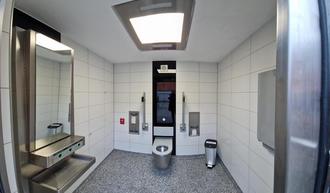 Das barrierefreie WC ist nun täglich von 7-23 Uhr geöffnet. Zwei weitere Damen- und Herren-WCs können zusätzlich für Veranstaltungen freigeschaltet werden. Viele Prozesse der Anlage sind automatisiert und nutzerfreundlich gestaltet. Bei der Projektplanung wurde neben Funktionalität und „Sich-optisch-Einfügen“ auch auf gut zu reinigende Materialien geachtet, um die Unterhaltungskosten möglichst gering zu halten.