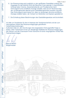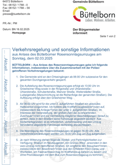 Am Rosensonntag, 2.März 2025, ab 14:11 Uhr findet der traditionelle Rosensonntagsumzug durch die Büttelborner Ortsmitte statt. Organisator ist der Kulturring Büttelborn e.V. mit Unterstützung der Gemeinde Büttelborn. Der närrische Lindwurm umfasst in diesem Jahr rund 60 Zugnummern und wird als das fastnachtliche Großereignis in der Gemeinde bei hoffentlich gutem Wetter wieder tausende Besucher anlocken. Um die Engstellen und Hotspots des Zugverlaufs zu entschärfen wurde wieder ein Glasverbot für alle Besucher und Teilnehmer für die Mainzer Straße und deren Einmündungen erlassen. Ebenso kommt auch dieses Jahr wieder ein Securityunternehmen zum Einsatz, um die örtlichen Ordnungskräfte im Bereich der Mainzer Straße zu unterstützen, die Zugdurchfahrt zu sichern, Vandalismus zu verhindern und das Glasverbot zu kontrollieren. Leider ist es unvermeidlich, dass sowohl die Zuschauer als auch die Zugteilnehmer des fastnachtlichen Großspektakels eine ganze Menge an Müll produzieren und zurücklassen. Dabei liegt die erste Priorität der Veranstalter nach Zugende darin, das jährlich wachsende Müll- aufkommen zeitnah zu entfernen. Eine Aufgabe, die nur von allen Beteiligten in gemeinsamer Anstrengung bewältigt werden kann. Um eine erste Grundreinigung zu gewährleisten und die Anlieger in ihrem Engagement zu unterstützen, hat der Gemeindevorstand erneut ein Reinigungsunternehmen damit beauftragt im Anschluss an den Zug die Umzugsstraßen – Uhlandstraße, Schubertstraße, Mainzer Straße, Weiterstädter Straße, Ludwigstraße und den Bereich der Zugaufstellung zu reinigen. Zusätzlich sind nicht nur alle beteiligten Gastronomen und Standbetreiber gefordert, die zeitnahe Reinigung von Fahr- und Gehwegen tatkräftig zu unterstützen, die Gemeindeverwaltung appelliert auch an alle Anlieger, durch deren Straßen der Rosensonntagsumzug führt, mitzuhelfen die Spuren des Umzugs zügig zu beseitigen und damit die Verkehrssicherheit wieder herzustellen. Alle Verkehrsbeschränkungen gelten ab 10 Uhr und werden ab 19 Uhr Zug um Zug aufgehoben. Die Busse fahren ganztägig von der Ersatzhaltestelle in der Taunusstraße. Schon jetzt bedanken sich die Veranstalter bei den Anliegern, die Jahr für Jahr durch ihr Verständnis und ihre Hilfe zum Erfolg des Fastnachtsumzuges beitragen. Wir hoffen, mit der Verpflichtung des Reinigungsdienstes, der Aufstellung von DIXIs im Bereich der Zugaufstellung und im Bereich der Mainzer Straße – Ecke Gässelweg, Historisches Rathaus und Rathausplatz, dem Einsatz des Bauhofs, des Ordnungsamts, der Einrichtung einer Hilfestelle durch Feuerwehr und DRK, der Verpflichtung von Zugordnern sowie Umleitung des öffentlichen Personennahverkehrs, der Sperrung der Umzugsstraßen, einer umfassenden Polizeipräsenz in der Ortsmitte alle Maßnahmen zum Gelingen des Rosensonntagsumzuges 2025 getroffen zu haben.