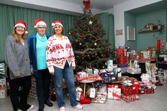 (vl.) Yanina Freundorfer (Caritaszentrum Kelsterbach), Agneta Becker (Städtische Sozialarbeit) und Sara Bouhouchi-Gouhar (Caritaszentrum Kelsterbach) freuen sich über die wieder sehr gelungene Weihnachtswunschbaumaktion.
