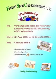 Der Verein wird für Speis und Trank sorgen. Einige Tische sind noch zu vergeben. Für einen Obolus von 5 Euro könnt Ihr Euch einen Stand (Zeltgarnitur) reservieren. Bitte macht im eigenen Interesse viel Werbung. Weitere Infos auf unserer Homepage FSC Kelsterbach.