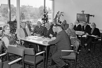 Das Bild aus dem Frühjahr 1966 zeigt eine illustre Runde im Gemeinschaftsraum des zwei Jahre zuvor neu errichteten Altenwohnheims in der Moselstraße. Es ist durchaus denkbar, dass die Damen und Herren einer Reiseberatung beiwohnten. Es war zu jener Zeit nicht ungewöhnlich, dass Vertreter von Reiseagenturen in Betriebe und andere Einrichtungen kamen, um die schönsten Reisen und deren Annehmlichkeiten den Reisewilligen zu präsentieren. Natürlich trat man dem Vertreter in obligatorisch ordentlicher Kleidung entgegen – Damen im Kleid und Herren mit Anzug, manche gar ganz leger ohne Krawatte. (Text/Bild: cs/Stadtarchiv)