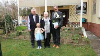 Dieter Bergmann, Urenkelin Leni, Erica Bergmann und Bürgermeister Manfred Ockel freuen sich über das runde Jubiläum.