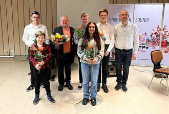 Die Klavier- und Gitarrenklasse von Frank Koch mit Musikschulleiter Marc Fischer (r)