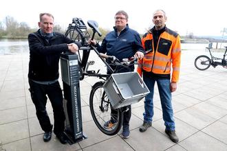 Fahrradbeauftragter Roland Rücker, ADFC-Vorsitzender Kreis Groß-Gerau Mario Schuller und Siegfried Roscher vom KKB (von links) probieren die neue Reparaturstation aus.