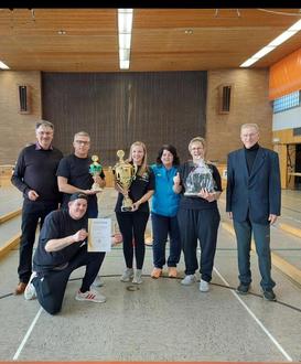 Stadtmeister 2024 „The Fantastic 4“ mit Bürgermeister M. Ockel (li.) Bosselchefin R.Rappl (Mitte) 1.Vorsitzender R. Pfennig (r.)