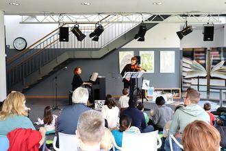 Am vergangenen Samstag war das Ensemble „Klassik mit Spaß“ zu Gast in der Stadt- und Schulbibliothek. Im Gepäck hatten die Pianistin Sofia Rubashkina und der Geiger Ostab Shpik ein wahrhaft tierisches Programm. Es war ein Konzert, bei dem alle mitmachen durften. So bekamen die Kinder beim „Schwan“ von Camille Saint-Saëns weiße Tücher, mit denen sie die wiegenden Bewegungen eines schwimmenden Schwans darstellen konnten. Beim Stück „Die Biene“ von Franz Schubert summten alle mit und flatterten mit ihren Armen wie eine Biene mit ihren Flügeln.