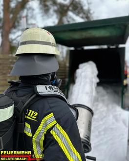 Mit der Seilwinde unseres Rüstwagens zogen wir die Müllpresse einige Meter aus dem Stellplatz heraus, um diese zu öffnen und den Brand zu löschen. Mehrere Trupps waren unter Atemschutz im Einsatz, um alle Glutnester ausfindig zu machen. Zum Abschluss der Löschmaßnahmen wurde die Brandstelle mit einem Schaumteppich abgedeckt.