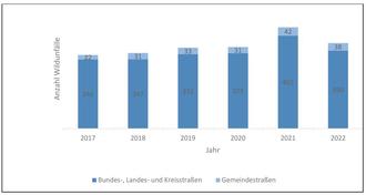 Die Unfallkommission des Kreises Groß-Gerau - bestehend aus Hessen Mobil, Polizei und Unterer Straßenverkehrsbehörde - weist auf die Entwicklung der Wildunfälle in den vergangenen Jahren hin. Bei den Zahlen, die im Schaubild festgehalten sind, handelt es sich lediglich um von der Polizei aufgenommene Wildunfälle. Es ist daher davon auszugehen, dass die tatsächliche Anzahl höher ist.