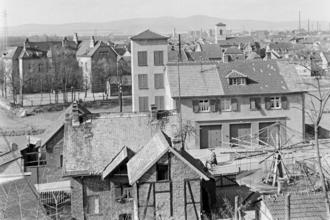 Ein Bild vom 28. März 1953 zeigt einen freien Blick über die Dächer des Unterdorfes, auf die Höchst AG bis hin zum Taunus. Schön zu sehen in der Bildmitte ist das alte Feuerwehrgerätehaus und dahinter die damalige Mainschule, heute Bürgermeister-Hard-Schule. Wer genau hinschaut, sieht rechts im Bild das Gerippe des Etagenkarussells, das dort, wenn es nicht auf Tour war, eingemottet wurde. (Text/Bild: cs/Stadtarchiv)