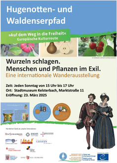 Am Sonntag, 13. April, ist die Wanderausstellung „Wurzeln schlagen. Menschen und Pflanzen im Exil“ letztmalig im Stadtmuseum Kelsterbach zu sehen. Die Schau des Hugenotten- und Waldenserpfad e.V., die seit anderthalb Jahren durch ganz Deutschland tourt, zeigt anschaulich die Beiträge der Glaubensflüchtlinge Hugenotten und Waldenser zur Kulturgeschichte von Acker- und Gartenbau, Ernährung und Kochkultur in Deutschland. Auf Stelen, Fließen, Themenwürfeln, großen Hängeregister-Karten, Stoff-Bannern und auf einem Kartoffelsack finden sich zahlreiche Informationen über Gartenbau der Hugenotten, Weinbau, hugenottische Bierbrauer in Berlin, die Verbreitung der Kartoffel oder über den Erfinder des Dampfdrucktopfs.