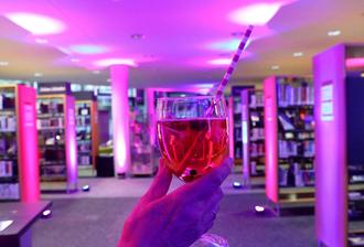 Am Freitag vergangener Woche fand die erste bundesweite Nacht der Bibliotheken statt, an der sich allein in Hessen 140 Bibliotheken beteiligt haben, darunter auch die Kelsterbacher Stadt- und Schulbibliothek. Von 19 Uhr bis 22 Uhr wurden der Innenraum und die Außenfassade des Gebäudes mittels Leuchtstrahlern in stimmungsvolle Pink- und Blau-Töne getaucht, während sich den Besucherinnen und Besuchern an verschiedenen Stationen ein abwechslungsreiches Programm bot. So wurden der Beleuchtung farblich angepasste nicht-alkoholische und alkoholische Cocktails gereicht, es gab mehrere Kreativtische und die digitalen Angebote der Bibliothek wurden vorgestellt. Darunter die neue Bibliotheks-App „mobile OPAC“, die von Bibliotheksmitarbeiterin Alexandra Neder auf bereitgestellten Tablets erstmalig der Öffentlichkeit präsentiert wurde. Natürlich gab es an dem Abend auch reichlich Gelegenheit, im umfangreichen Buchbestand zu schmökern oder im Lese-Café einfach nur einen entspannten Feierabend zu genießen.