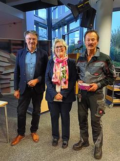 (vlnr.) Bürgermeister Manfred Ockel begrüßt die Autorin Helga Blohm und Klaus Baumeister zur Lesung in der stadt- und Schulbibliothek.