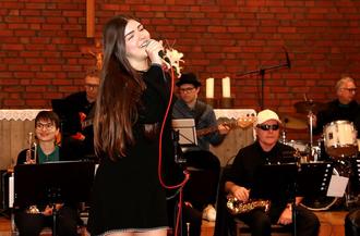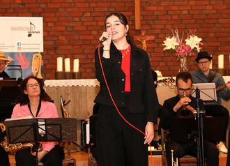 Eine schöne Überraschung war, dass die Big Band bei einigen Stücken von Gesangsschülerinnen von Dozentin Krista Ndoja unterstützt wurde. Fiona Zuka lieferte zum von Billie Holiday unsterblich gemachten Jazz-Klassiker „All of me“ eine charmante Performance ab, bei der sie stimmlich auf ganzer Linie überzeugte. Viktoria Kabatek verzauberte das Publikum mit ihrer Darbietung des Norah Jones Hits „Don’t know why“ und Sienna Marlene Urso, die im März einen zweiten Preis beim Landeswettbewerb Jugend musiziert gewonnen hat, sorgte für ganz viel Frauenpower mit ihrer Interpretation des Aretha-Franklin-Klassikers „Respect“. Abschließend trat auch noch Ndoja selbst ans Mikrofon und brachte mit „September“ von Earth, Wind & Fire einen Hauch von Sommer in die Christuskirche. Den drei Nachwuchstalenten war anzumerken, dass es für sie ein besonderes Erlebnis war, einmal live von sattem Big-Band-Sound begleitet zu werden. Die Freude, die sie beim Singen ausstrahlten, übertrug sich dann auch auf das Publikum, das die Darbietungen mit lautem Applaus würdigte.