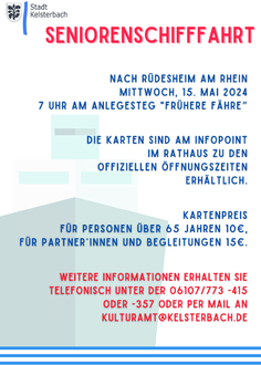 Bei Fragen zur Organisation und dem Ablauf der Seniorenschifffahrt steht das Team 7.1 Kultur, Sport, Vereinsarbeit, Museum, Sport- und Wellnessbad unter den Telefonnummern 06107 773 -415 oder -357 sowie per Mail an kulturamt@kelsterbach.de gerne zur Verfügung. (sb)
