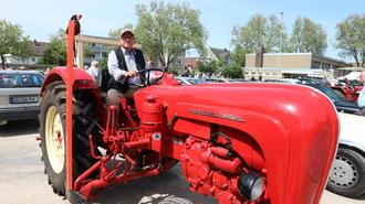 Vereinsvorsitzender Norbert Kleiner hatte zu diesem Zweck selbst seinen Opel Kapitän aus dem Jahr 1959 mitgebracht. Der himmelblaue Wagen wurde von ihm komplett restauriert und wird seitdem gehegt und gepflegt. Insgesamt 174 Autos von der Nachkriegszeit bis in die späten 1980er wurden auf dem Platz bei schönstem Sonnenschein ausgestellt. Da war der Simca Bagheera, ein Dreisitzer komplett aus Kunststoff gefertigt, Baujahr 1977, zu bestaunen. Aber auch ein Porsche-Traktor mit dem Baujahr 1961, den der ehemalige Fahrschulinhaber Willi Laun sein Eigen nennt. Der Traktor war einer der letzten, die die Firma Porsche produziert hatte, und leuchtet in einem knalligen Rot. Laun kaufte ihn komplett restauriert mit Zertifikat, das den Traktor als neuwertig einstuft. Entsprechend stolz ist er auf sein 30-PS-Gefährt, das maximal 40 Stundenkilometer schnell fährt.